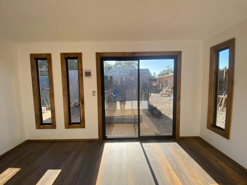 Esta modular de 18 m² es una solución moderna y funcional para emprendedores que buscan un espacio comercial compacto, bien diseñado y listo para operar. Con planta libre para distribuir el mobiliario según necesidad y equipada con dos medios baños, esta unidad se adapta perfectamente a actividades gastronómicas, cafeterías móviles, food trucks fijos o puntos de atención al cliente en ferias y eventos. Su construcción combina materiales de alta calidad como revestimiento exterior en siding de fibrocemento, interior en OSB y volcanita lisa, aislamiento térmico completo en muros y techo, y piso vinílico tipo click. También incorpora un ventanal corredero y ventanas termopanel de aluminio negro, garantizando luz natural y eficiencia energética. La instalación eléctrica es robusta y moderna, con múltiples puntos de luz, enchufes y tablero de 25 A. Esta cafetería está lista para personalizar y operar.